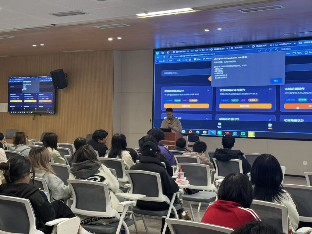 陈秋然先生首先以ACM Siggraph Asia 2024比赛中的获奖动画作品为引,讲解AI技术如何运用到动画的制作中。并展示了使用国内自研的AI辅助学习工具Kimi,现场生成四川音乐学院成都美术学院动画系网站,体现出AI辅助学习工作的高效与便捷。进而总结出AI与视频结合的三大方向:生成式AI、3D重建技术以及动态生成。