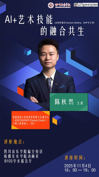 11月4日,四川音乐学院成都美术学院动画系在临空校区B103学术报告厅举办了《AI+艺术技能的融合共生》的讲座。本次讲座由动画系副主任邓育林教授主持,由Siggraph成都学会秘书长陈秋然先生主讲。